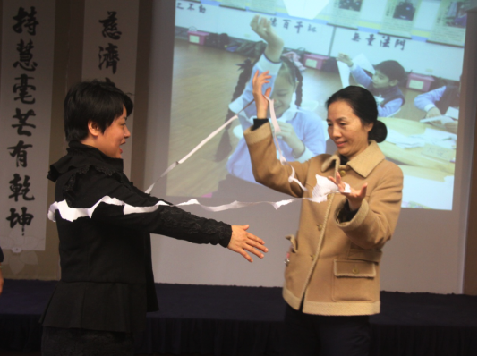 图说:黄富子老师首先让学员体验“好大一个洞”游戏,把一张A4的纸撕成一个让身体可以穿过去的洞,先决条件是不能拉断纸张。摄影/秦洪