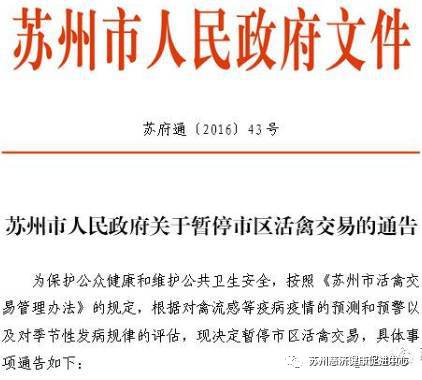 苏州市人民政府已发布了关于暂停市区活禽交易的通告。